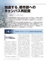 リクルート カレッジマネジメント195 / Nov. - Dec. 2015加速する、都市部へのキャンパス再配置2010年の特集では、首都圏の大学の都市部へのキャンパス再配置について分析を行った。本特集では、2009年以降の6年間において、首都圏(東京都・神奈川県・埼玉県・千葉県)、中京圏(愛知県・岐阜県・三重県)、近畿圏(大阪府・京都府・兵庫県・滋賀県・奈良県・和歌山県)の都市部(東京23区、名古屋市内、大阪・京都・神戸市内)へのキャンパスの再配置について分析を行う。2010年の特集では、首都圏における2000年から2009年の収容定員は、人数・比率ともに東京23区の都市部への移動傾向が顕著に表れた。では、2009年以降2015年まで収容定員はどう変化しているだろうか。文教協会『全国大学一覧(平成16年度〜平成27年度)』を基に、首都圏・中京圏・近畿圏の大学の学部(夜間主・二部含む)の収容定員について、2009年と2015年を集計・比較してみた(図表1)。 各学部・学年別のキャンパス所在地別に収容定員を集計し、都市部と分け、収容定員数と比率について比較したものだ。まず、首都圏から見てみよう。首都圏全体の収容定員は、2009年が93.1万人であるのに対し2015年は94.4万人と、1.3万人増加(1.4%UP)。ただし内訳を見ると、都市部である東京23区の収容定員は、2009年に36.2万人であったが、2015年には40.2万人となり4.0万人増加(11.2%UP)、首都圏全体に対する比率は、38.9%から42.6%へと3.7ポイント増加した。一方、東京23区を除く東京都下の収容定員は、2009年18.7万人から2015年18.1万人へ減少した。同様に千葉県は、2009年10.8万人から2015年9.7万人、神奈川県は、2009年16.9万人から2015年15.8万人に減じた。埼玉県は、2009年10.5万人から2015年10.7万人に増加。東京都下、千葉、神奈川から東京23区への定員移動があったことが推測される。次に、中京圏を見てみよう。中京圏郊外から都市部へのキャンパス再配置が加速寺裏誠司 リクルート進学総研 客員研究員2010年の「都市部を目指す大学」特集では、1970年代から90年代にかけて郊外型キャンパスを開設した大学の間で、2000年から2009年にかけて都市部に回帰する動きが活発化していることが報告されている。特に、郊外キャンパスで学んでいた1・2年生を都市部に戻し、4年間一貫教育を行って教育効果を上げようという動きが目立っている事例を紹介した。今回の特集では、2010年以降の5年間の首都圏・中京圏・近畿圏の大学のキャンパス再配置に焦点を絞り報告を行う。1章では、各地区における都市部の収容定員の推移を見ながら、学生数がどの程度都市部に動いているかを分析する。さらに、実際に行われた移転の動きから傾向を分析する。2章では、近年の5年間にキャンパスを再配置した大学事例と志願者の動向を追いかける。3章では、今後行われる予定のキャンパス再配置計画についてまとめた。最後に4章では、キャンパス再配置の留意ポイントについて解説する。東名阪いずれのエリアでも、都市部の収容定員が増加1章