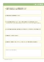 [本人の希望・状その他に気になることがあればご自由にお書きください志望校の過去の入試情報を調べているか?7AO入試や推薦入試を考えているか? 考えている場合、志望校がどんな入試内容か調べてみたか?*AO入試の内容は、学校によって全く異なり、高度な自己PR文を要求されることが一般的です。そのことについて子どもがすでに調べて準備済みかどうかを確認しましょう。8AO入試や推薦入試を狙う場合、志望の理由(なぜその学校なのか、そこで何を学びたいか等)が明確かどうか?9受験に際して、今心配なことはあるか?10受験に際して、保護者にして欲しいサポートと、して欲しくないことは?(費用、食事などの生活面など)11志望校の入試方法やスケジュール、試験傾向は把握しているか?受験までどう勉強を進めるか、勉強の年間計画は考えているか?6