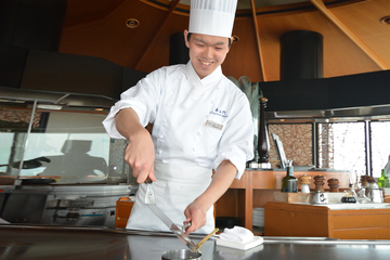 卒業後先輩の仕事紹介調理はもちろん、オープンキッチンでは笑顔の接客も大切にしています