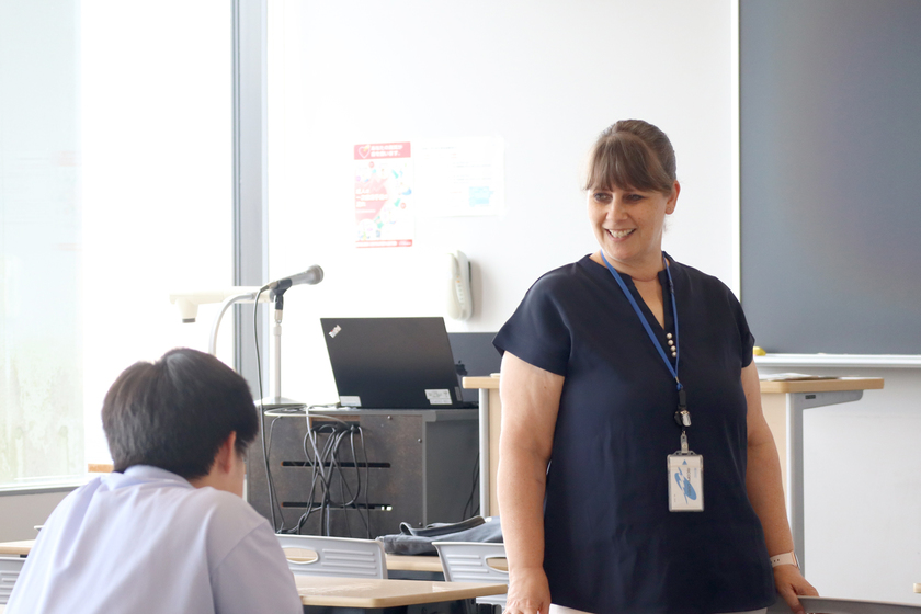 英語を「正しく話す」ことよりも「目的を達成するために使う」ことを重視した「Task-based language teaching」を導入。基本的な文法構造を確認しながら、「話す・聴く・読む・書く」の4技能に焦点を当て、学習した英語を実際に活用する力を養う。教員が用意した課題に取り組み、英語の知識を使って情報を整理し、意見交換やディスカッションを通して問題解決へと導く。ネイティブスピーカーの指導のもと、本物の英語環境で学びながら、実践的で自然なコミュニケーション力を身につけることができる。
