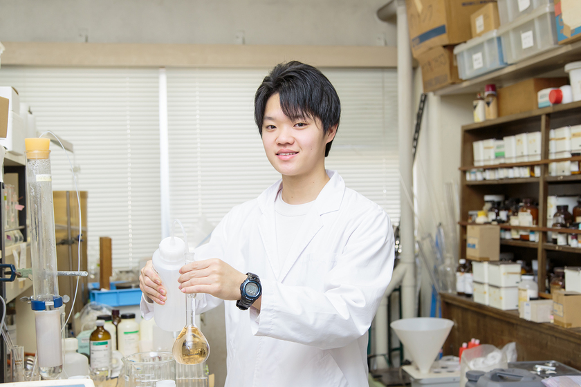 岡山理科大学大学院 理工学研究科 自然科学専攻 物質科学コース/理学部 化学科(2024年3月まで在籍)/理科系科目の中でも、とりわけ化学分野に興味津々。子どものころから「氷はなぜ水に浮くのだろう」というようなことを考えていた。大学進学で香川から岡山へ。キャンパスまでは自転車で15分と便利。居酒屋でのアルバイトも継続中。
