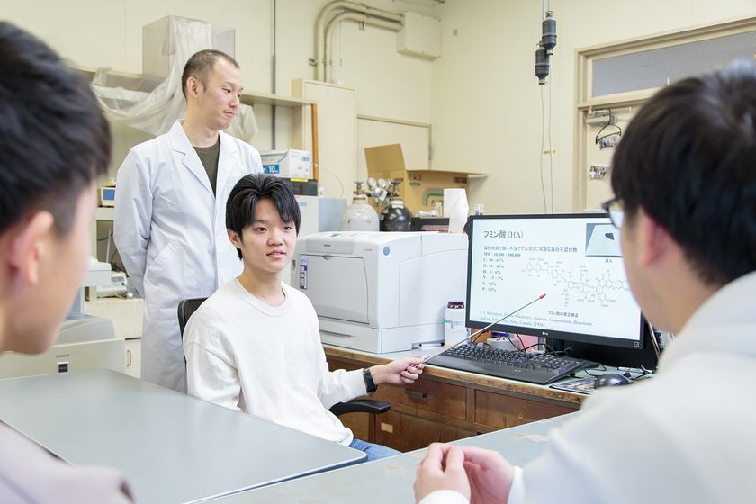 岡山理科大学の大学院で、川の中の有機物の定量(ある物質中に含まれる成分の量を定めること)を行っています。絵の具を溶いた水を思い描いてみてください。絵の具の量によって透明度が変わってきますよね。似たようなイメージで、川の水に光を当てることで濃度を特定します。今はそのための条件を確定させている段階で、いずれは川の上流から下流までどのような濃度分布になっているかを調べる予定です。川の環境改善のためにも重要なデータになります。研究には失敗が付きもので、仮定してやってみると全然違う結果になることも。しかし失敗もまた大事なデータで、次に進むことができます。難しいだけに、とても挑戦しがいがあります。