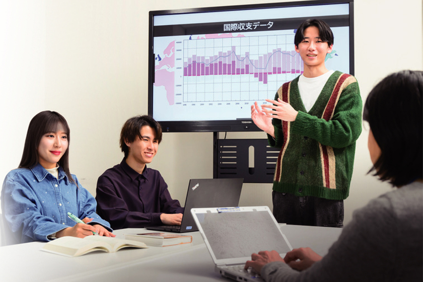 小田先生のゼミでは、「学生に経済学の基礎を身につけてもらい、将来、金融機関をはじめ多彩な業界で地域のリーダーとして地域を支えていってほしい」との考えから、学生一人ひとりが自由に、好きなテーマを研究できるようにされています。またフロントランナープログラム(特進ゼミ)」制度を活用することで、2年次から先生のゼミに参加が可能となり、意欲次第で専門的な勉強を早い段階から始めることができます。実際に先生のゼミで学んだ卒業生は、証券会社やメーカー公務員など多彩な分野で活躍しているとのことでした。