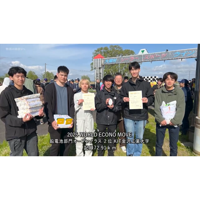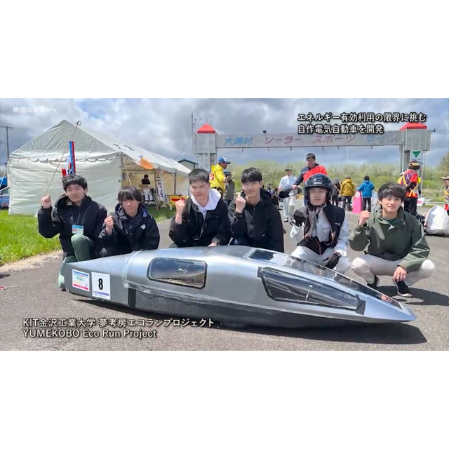 5月、究極の省エネカーレース「ワールド・エコノ・ムーヴ」が今年も秋田県大潟村で開催され、KIT金沢工業大学夢考房エコランプロジェクトが出場、嬉しい初の表彰台となりました。夢考房チームが出場した鉛電池部門は、大会側から支給される同一コンディションのバッテリーを用いて、2時間の走行距離を競います。今年は、車両を新しく製作。軽量化をコンセプトに、あえて木製のフレームを採用するなど学生たちの斬新なアイデアが随所に組み込まれています。自分たちが作り上げた車がコースを駆け抜ける姿に、大会のエネルギーマネジメントを担った金子誠志郎さんは大きな充実感をもったに違いありません。