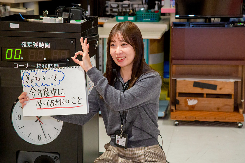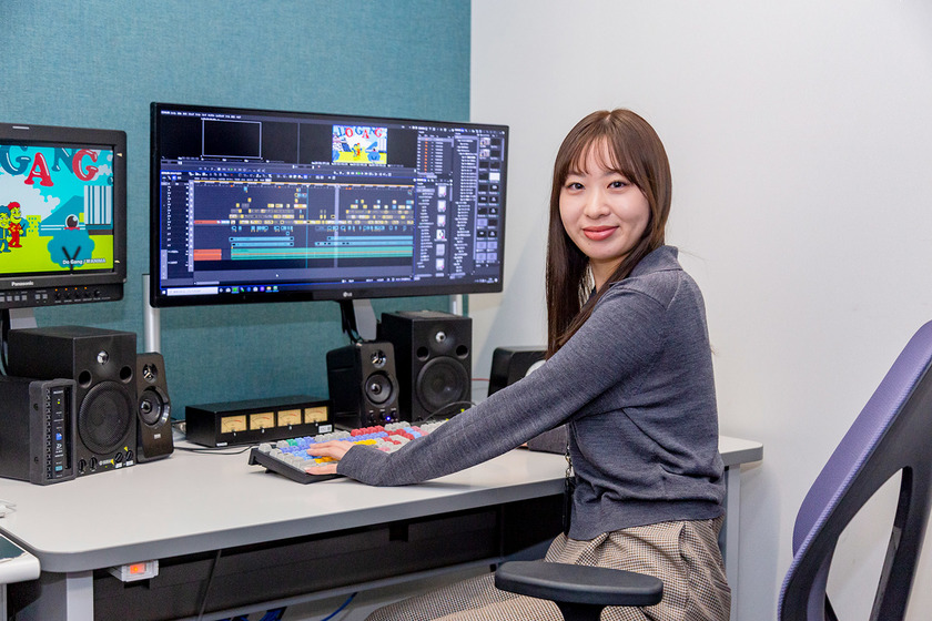 株式会社熊本県民テレビ/外国語学部英米学科/2023年卒/見逃し配信などで放送後にも楽しめるようになりましたが、その分制作側は注意することも多く、厳しい制約の中で視聴者に笑いを届けるために、日々試行錯誤を繰り返しています。そんな状況の中でも「番組制作は決して一人では成り立たず、スタッフ同士が意見を出し合い、協力しながら形にしていく仕事です。その過程には、ものづくりの面白さと達成感が詰まっています。大変なこともありますが、それ以上に「楽しい」「もっと良いものを作りたい」と思える毎日を過ごしています。」と笑顔で語る豊嶋さんの頭の中は、今日も面白い企画であふれています!
