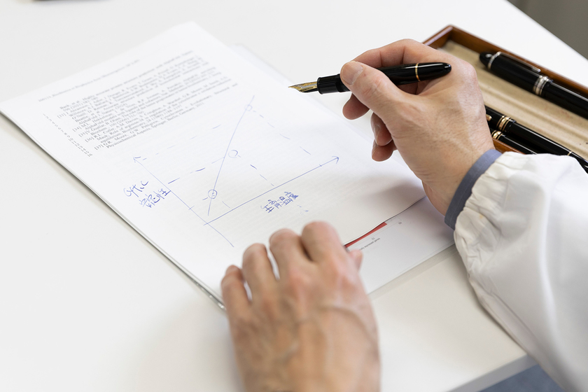 「書くこと」を重視する三本木教授。授業では書画カメラを活用し、五感をフル活用することにより理解を促す
