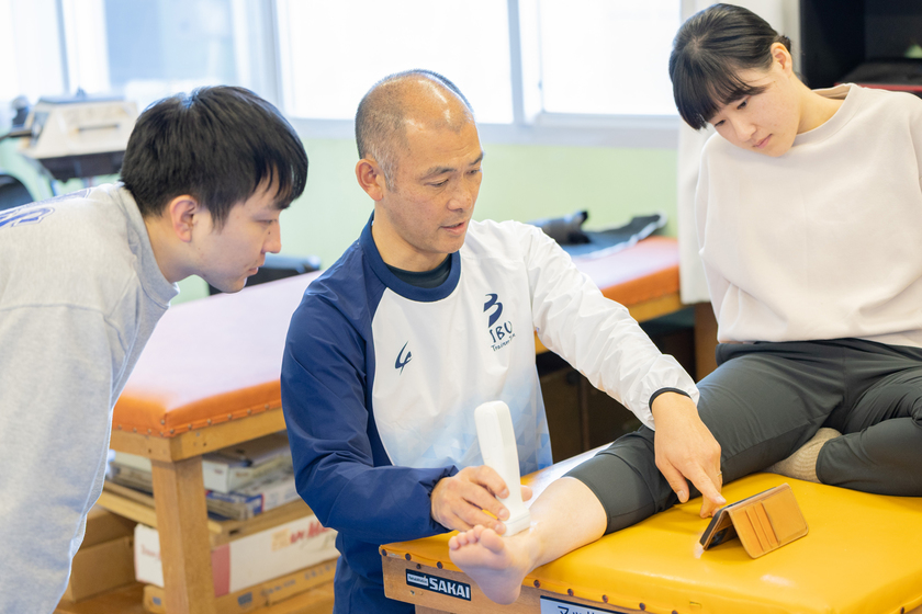 ヘッドコーチを務めるトレーナーチームでは、学内外の医科学サポートを中心に、学生の人間形成がコンセプト。クラブ活動が活発で実技の授業も多いので、予防はもちろん、怪我に対して迅速な対応が課題となります。すべてのクラブ活動などを一人で担当するのは困難なので、協力してくれる学生トレーナーを育成し、怪我などの際には現場で対応できる仕組みを構築。学生たちは実践的な活動を通して、トレーナーとして着実に力を伸ばしています。またコンディショニング室の室長としても活動しており、競技力向上のトレーニング管理から、怪我予防のためのフィジカルチェック、怪我の際の対応など、スポーツに特化した支援を幅広く展開。約40年前にスタートしたこの取り組みは日本ではまだ数が少なく、大学の認証評価からも高く評価されています。