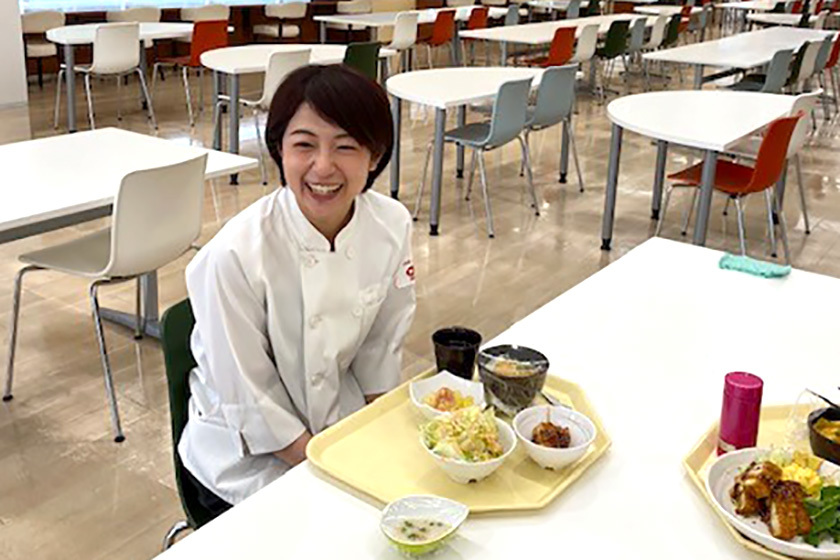 私の勤務先エームサービスジャパンは、企業や医療・福祉施設、教育機関、スポーツ施設など、様々な施設に事業所を持つ委託給食会社です。管理栄養士の仕事の幅も広く、入社2年目には実業団ラグビーチームの栄養管理を担当。現在は工場内の社員食堂で、約400名のお客様に食事を提供しています。健康志向が高い企業なので、「健康米の日」や「サラダ半額の日」を設けるなど、従業員の健康増進に関する様々な取り組みを行っています。また食事をより楽しめるよう、週に一度イベントメニューを提供したり、お客様の目の前で実演調理を行ったりします。お客様の多種多様なニーズを実現し、喜ぶ顔を間近で見られることに、やりがいを感じています。