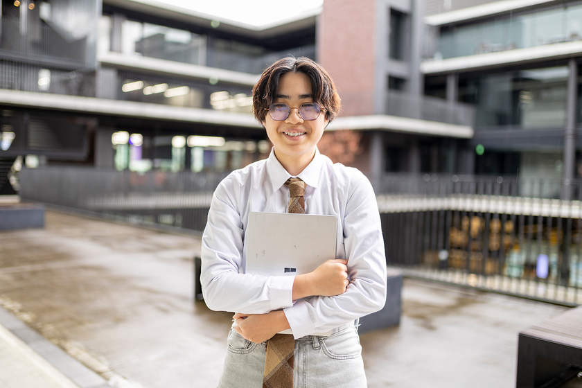 小さい頃からものづくりが好きでした。中学生になってから、スマートフォンの動画編集に熱中したことをきっかけに、自身の想像や興味に形を与え誰かを楽しませることのできる「情報」という分野に関心をもちました。