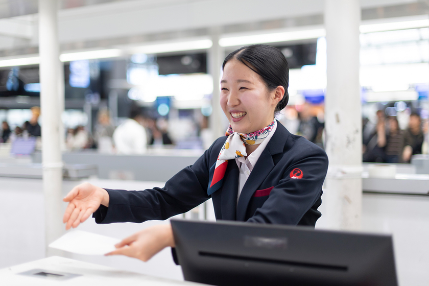 株式会社JALスカイ 成田事業所勤務/人文学部英語英米文学科 卒/2024年卒/幼い頃から英語に親しみ、英語を用いて日々世界中の人と関わる仕事に就くという夢をかなえた宅見さん。現在も、日々積極的に英語に触れ、英語学習を継続しているといいます。「英語は単語一つでお客さまの受ける印象が変わってしまいます。言葉遣いという点で、日本語よりも一層意識を高めて柔らかく伝えることができるよう努めています」。一日の終わりには日記をつけ、その日の振り返りを行います。お客さまの対応について顧みることにより“今”の自分を把握し、明日はもう一歩先へ進めるように心がけているそうです。
