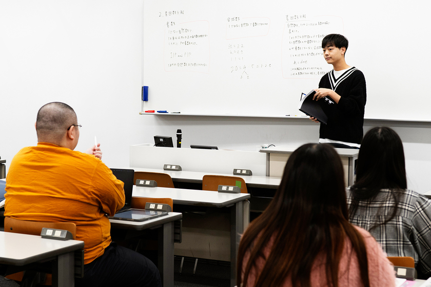 ゼミでは、数学に関する図書を用いて、その内容を正しく検証・理解し発表します。最初は小川原助教が前に立って説明する機会も設けていますが、回を重ねるごとに「聞き役」になる時間を増やし、学生が理解していない、あるいは説明不足な点を指摘しながら、検証力やプレゼン力を養います。大学数学は高度で難しいイメージがありますが、すべてのベースとなるのは高校の教科書で学んだ知識。受験勉強で解いた問題ではなく、教科書をしっかりと理解しておくことが、大学での学びに繋がり、数学の面白さと検証のやりがいをより実感できます。