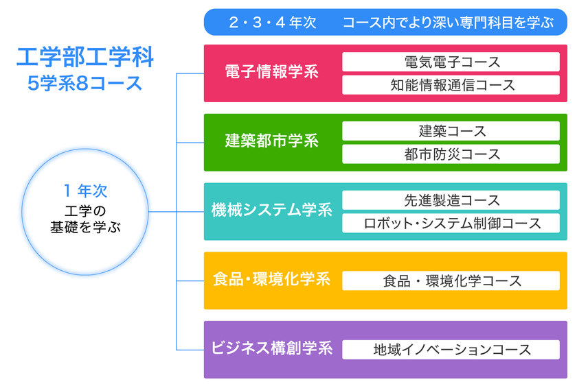 本講義は「ものづくりのコモンセンスを身につける」という視点から進められます。そして、本学における「工学の学び」を俯瞰することを目的とし、どの専門分野にも共通する工学の全体像について学びます。また、卒業後の進路について意識して学ぶための導入となる基礎的な事項の学びや、2年次以降に学ぶ8つのコースに関連する学問分野の内容を学びます。