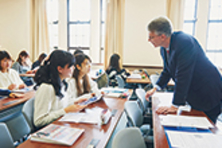 - 英語科目は1クラス15人以下の少人数制。発言する機会が多いのはもちろん、ディスカッションやプレゼンテーションをすることも多く、基礎から段階を踏みながら自然と英語に慣れていくことができます。先生やほかの学生との距離が近く、ペアワークも多いから気軽に質問ができる環境も魅力。また、語学の授業は理解度に合わせたクラス分けだから安心して学べ、着実にレベルアップをめざせます。