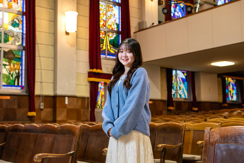 伝統あるチャペル。1年次はこちらで必須科目があります。最初はブライダル業界への憧れから入学しました。学ぶうちに選択肢が広がり、今は金融業界が目標となりました!