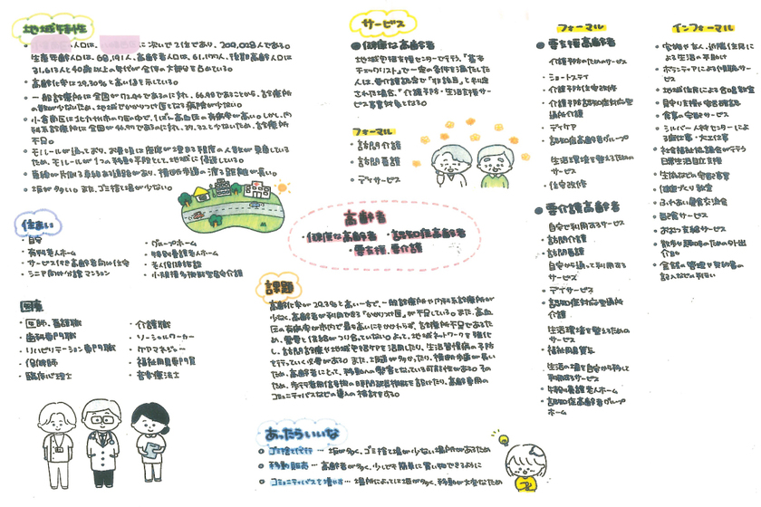 最終日には、見て・聞いて・感じ取った情報や学びをもとに地域資源マップを作成し、地域の強みや課題を可視化して共有。制度を知識として学ぶだけでなく、現場体験を通して、看護職として地域を捉える力を養います。