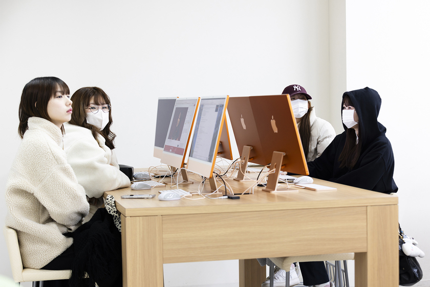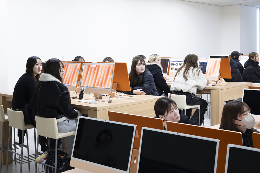 端末がずらりと並ぶ「MACルーム」にて「Digital Media I」の授業が行われる