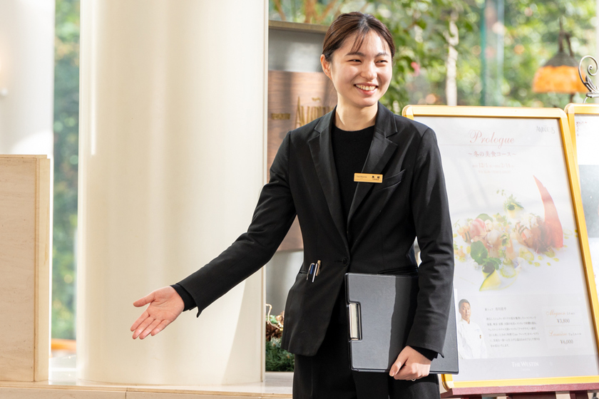 学生時代、飲食店でアルバイトをしていました。ホテルの仕事に興味を持ったのは、もっとフォーマルなサービスを学びたいと思ったことがきっかけです。また、自分のサービスに対してお褒めの言葉をいただいたり、ゲストのお話を聞いたりすることが楽しく、この仕事を続けたいと思いました。きっとホテルや飲食業の世界にはまだまだ知らないことがたくさんあると思うので、お客様やスタッフなどいろいろな方と接して、知識を増やしていきたいと考えています。