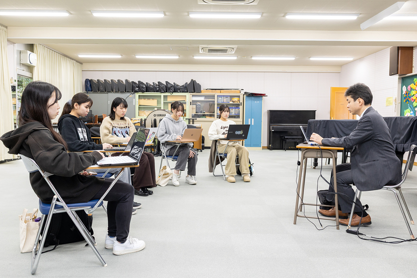 今釜先生が授業で心掛けていることは、強制しないこと。「子どもは強制されると興味・関心を失います」と先生。教員や保育者を目指す学生が相手だからこそ、先生自身が強制しない授業作りを行うことで、学生たちも子どもが興味・関心を持つ授業作りの大切さを学びます。そんな先生の授業は極めて実践的。現場ですぐに必要となるICT機器や生成系AI、アプリケーションなどをタブレットを使いながら学習。音楽の知識やピアノなどの技能も、事前に動画で確認して取り組む反転授業で理解度を上げるなど、積極的にICTを活用しています。