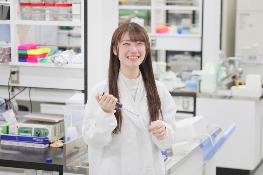 栄養科学科は、1年次は基礎的な授業が中心で、実習が多い実学主義が特長です。課題提出や出席を徹底して、単位を落とさないよう頑張っています。実験や実習は、学びながら経験を積めるのが魅力。管理栄養士の国家資格取得は大きな目標ですが、それだけでなく様々なことを経験しながら資格取得に挑みたいと思っています。