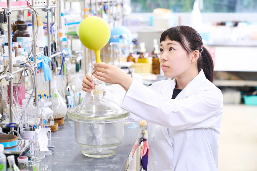 将来は、製薬企業の研究職に就き、医薬品の安定的かつ環境に配慮した合成方法の開発に携わりたいです。大学3年生頃から関心を持ち始めました。そのために今は、単に手を動かして作業するのではなく、実験操作の意味や原理を考えながら実験に取り組んでいます。