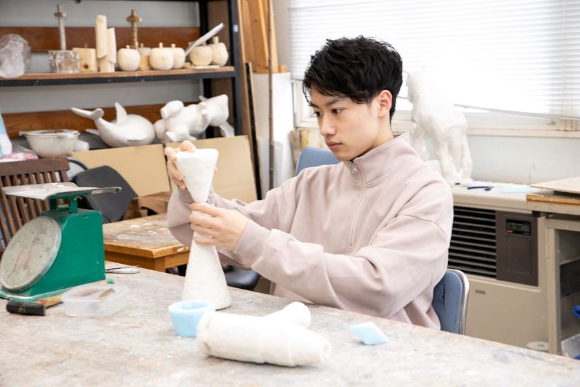 1年次は美術のさまざまな基礎を学び、自分はどの分野が向いているのかを理解する期間です。私が特に興味を持ったのは「立体構成」の授業。感情など、形のないモノを表現することが楽しいです。アイデアの力を鍛えるために日常でも身の周りをよく観察し、アイデアの引き出しを増やす意識をして過ごしています。
