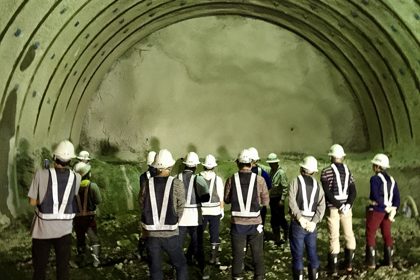 人やモノの流れ、乗り物やインフラ整備等を総合的に学ぶフィールドワーク重視(道路トンネル工事現場見学)