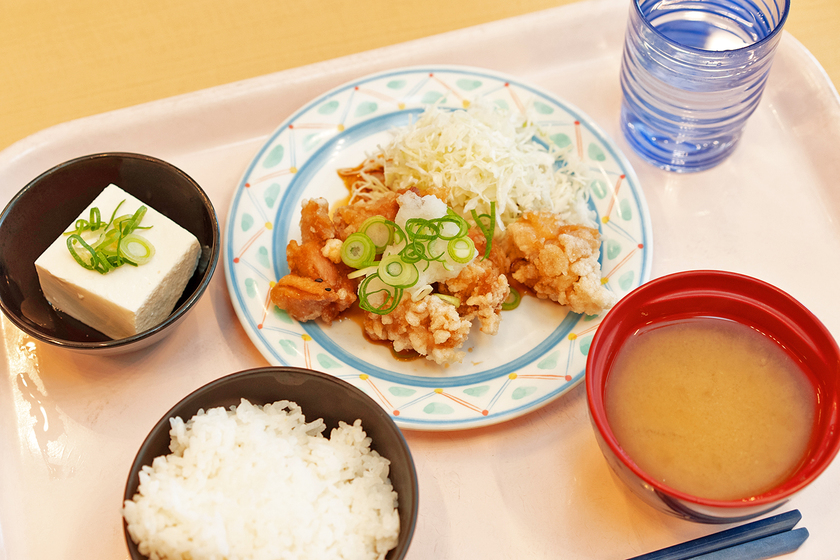 学食のメニューは週替わり。栄養バランスが満点で美味しいうえに、唐揚げもチキン南蛮や鶏ポンなど、いろんなバリエーションを楽しめます。さらに、さまざまな都道府県のフェア等もあって、北海道の海鮮丼や広島の穴子丼など、これまで食べたことのない料理も食べることができます。また、カフェは夜まで開いていて、ケーキやピザなどの軽食もあるので、アルバイト前の腹ごしらえにもピッタリです!