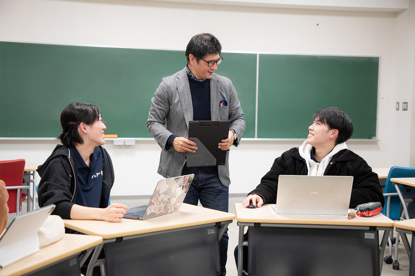 本授業では学生が「やりたい」ことを最優先にしています。先生は指導者というよりも、伴走者として、学生をサポートすることを大切にしています。授業での取り組みは多岐にわたり、SNSを活用した飲食店情報の提供や、インバウンド向けのガイドマップ制作などに取り組んできました。最近では、道南地域の洋上風力発電といった壮大なテーマにも挑んでいます。地域の人たちと丁寧に向き合い、調整を重ねる過程は決して楽ではありません。しかし、自分たちの活動が地域にどう貢献できるかを真剣に考える経験は、確かな成長につながります。