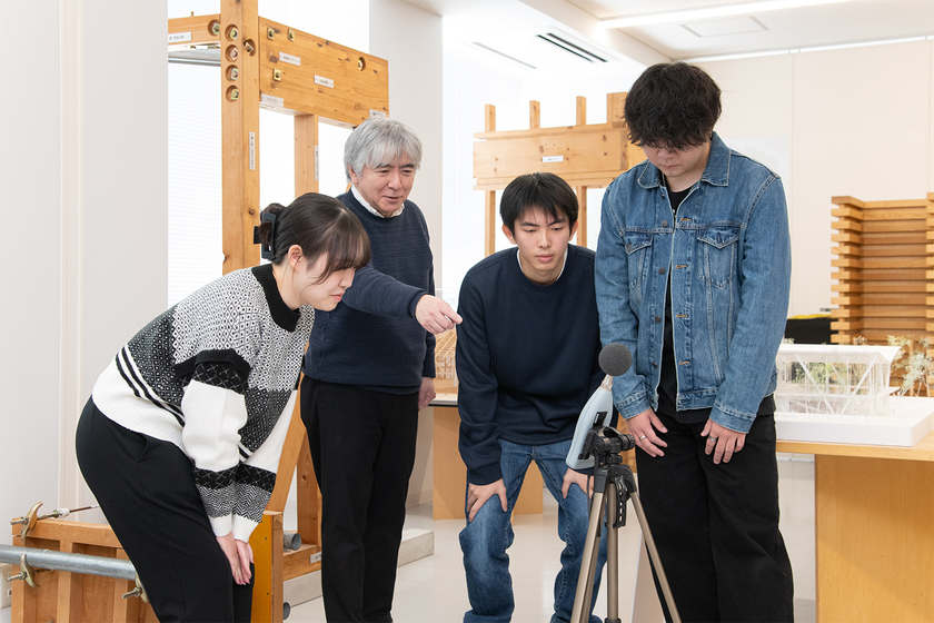 建築というと、カッコいいデザインや図面を描くことをイメージする人が多いかもしれません。しかし、人が本当に心地よく暮らすためには、「見えない性能」がとても重要です。この授業のテーマは「建築環境」。具体的には、普段目に見えない「音・光・熱」といった環境要素を、専用の機器を使って計測します。平川先生は元建材メーカー出身のプロフェッショナルです。現場を知り尽くした視点から、断熱性や遮音性が暮らしにどう影響するかを学びます。ただ図面を引くだけでなく、「この設計だと実際にどう感じるか?」を数値で理解することで、将来、住む人が本当に満足できる空間を提案できる設計者を目指します。感覚ではなく、科学的な根拠に基づいた「快適さ」のつくり方を学ぶ授業です。