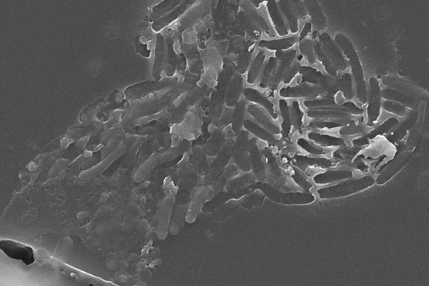 生成AIで設計したバクテリアがPETフィルムを分解する顕微鏡写真