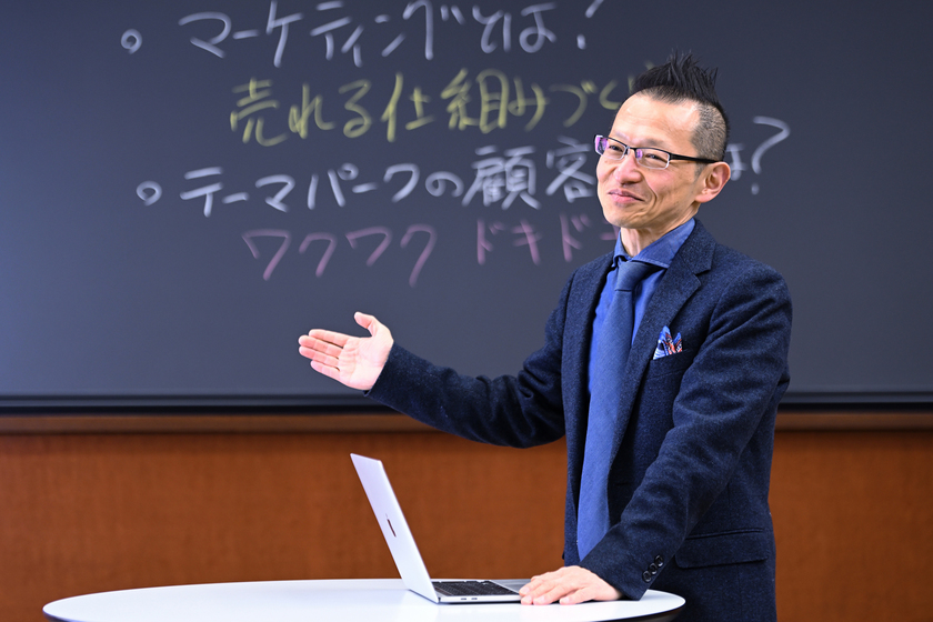 「マーケティングで大切なのはワクワク・ドキドキです。テーマパークが顧客に提供する価値がまさにそれです!」と語る小野教授。授業でもワクワク・ドキドキの体験を大切にする。それを叶えるのがアクティブラーニングだ。ビジネスの現場では教科書に書かれていないことや、書かれていることと逆のことが起こる。授業では、身近でなじみのある企業の事例を元に学生同士でディスカッションを繰り返したり、企業に出向いて職場体験をしたり、新しいビジネスを構想したりすることにより、受け身で先生の話を聞くのとは違う学びを実践する。