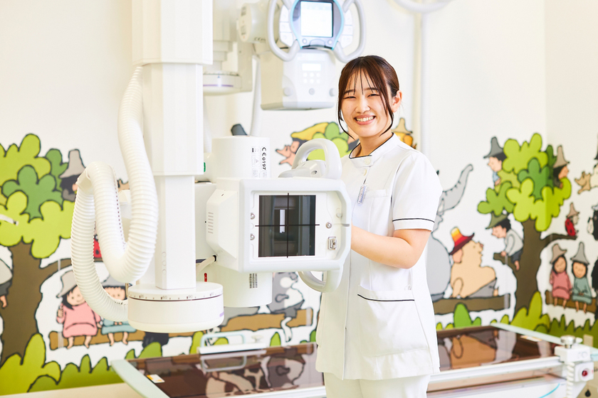 近江八幡市立医療センター 放射線技術科勤務/医療科学部 放射線技術学科/2022年卒/滋賀県立草津東高校卒表後、京都医療科学大学を卒業し、自宅に近い近江八幡市立医療センターで『診療放射線技師として働く』夢を叶えた中川さん。現在もそこに止まらず、マンモグラフィ(乳房X線検査)やアンギオグラフィ(血管造影検査)の研修を受けているとのことで、精力的に活躍中だ。
