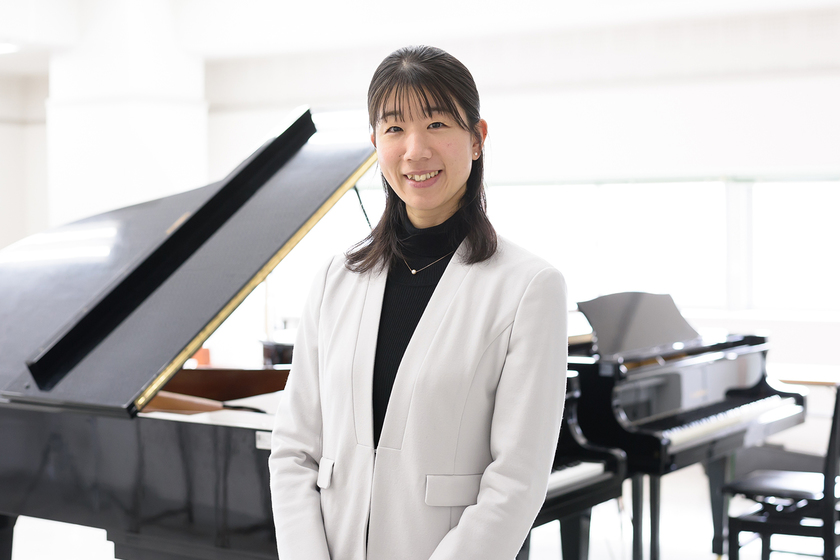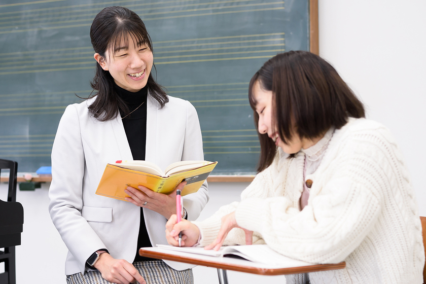 多彩な楽器や声楽の表現技術を学び、保育の実践力を身につけるチャイルド・ミュージックコース。深谷先生は専門であるピアノのレッスンを担当されています。「保育士になるためにはどうしてもピアノのイメージが先行して、難しそうと思われている部分もありますが、自らが音楽を楽しんで演奏することでその魅力や奥深さを感じ、のびのびとした表現を導き出せるよう模索しています」と深谷先生。入学してからのレッスンでは、学生一人ひとりのレベルに合わせてじっくり取り組める環境なので、ピアノに初めて触る人でも安心です。