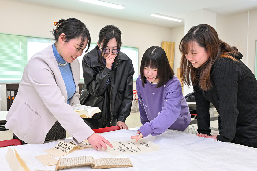 佐藤先生の授業では、近世期の地域資料を主に読み解いています。活字化された史料や、「くずし字」の読解を通して、その地域で起こった様々な出来事や生活の様子などについて考えたり、実際にフィールドワークに出かけたりなどもしています。「書いてある言葉や人について調べることで、具体的な歴史が見えてくるのが古文書解読の面白さ。実際には会えない昔の人と対話している感覚になれますよ」と佐藤先生。地域創成学科では学芸員資格課程もあるので、ぜひ「くずし字」にチャレンジしてその魅力に触れてみてください。