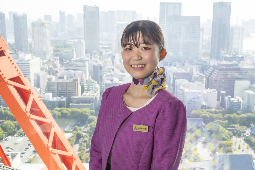実社会で通用するマナー・ホスピタリティ(R)を学べることがSAIJOの大きな特長。元キャビンアテンダントの先生方が、礼儀作法や周囲への「目配り」「気配り」「心配り」の大切さを徹底指導してくださいます。授業を重ねるにつれ、相手に見えている自分を意識する習慣が芽生え、常日頃から美しい立居振る舞いを心がけるようになりました。この習慣は、東京タワーの顔であるアテンダントの仕事にダイレクトに活かされています。さらにサービス接遇検定や秘書技能検定の資格取得や動物園でのインターンシップに挑戦するなど、さまざまな経験を積んだ2年間は、就職活動においても自分をアピールする強みにできました。