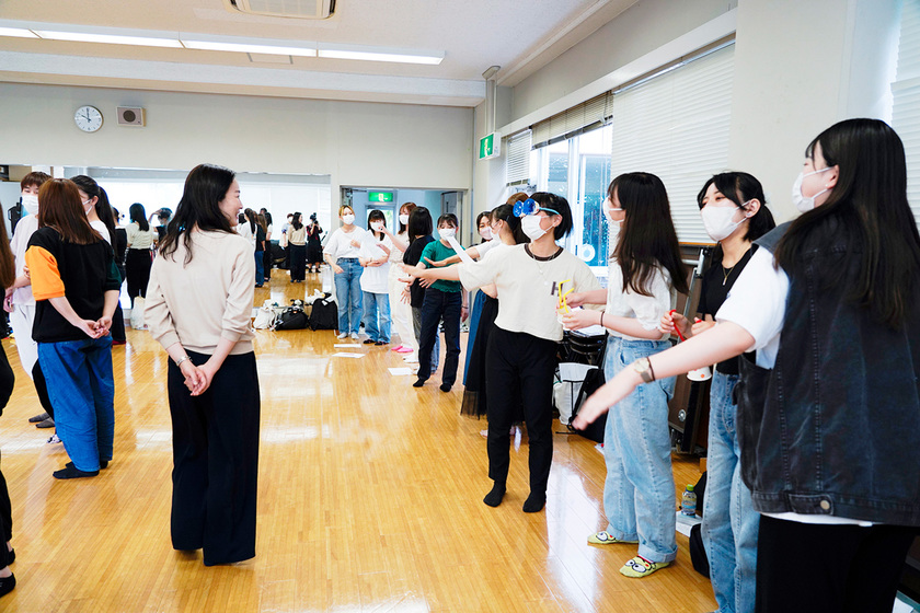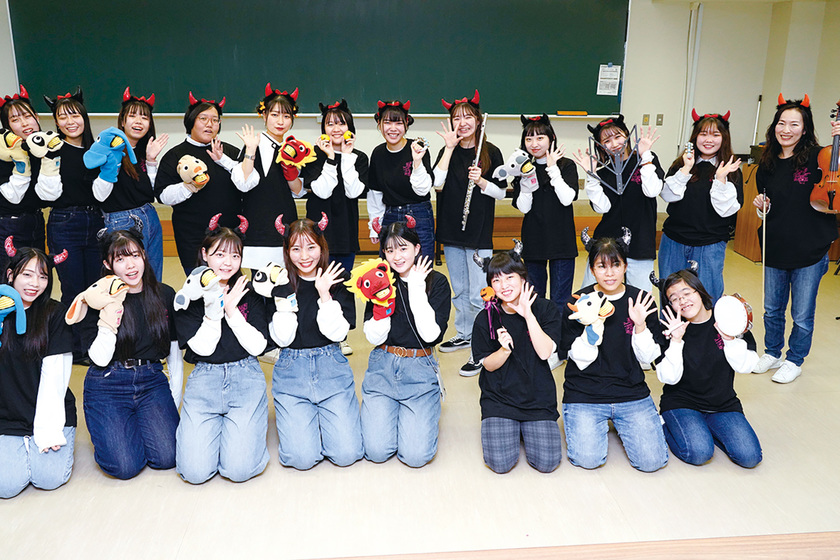 私が音楽教育でいちばん大切にしているのは“経験すること”。本来、音楽は教わるものというよりも、自分から関わり生み出されるもの。学生に身につけてほしいのは、子どもたちが自分の内にもつ思いやイメージを音や音楽で表現することを手助けできる力です。授業は、音に親しむことから始まります。グループで声や身体、箱や袋など、身の周りにあるもので音を出し、風や雨などをテーマにした“音作品”を作ります。そのためにはイメージを理解し共有する必要があります。ここで“音”が“表現”になるのです。自分たちが十分に音と遊んだ経験が、子どもへの適切な働きかけにつながります。さらに合唱で自分たちが主役としてステージに立つドキドキを味わったり、わらべ歌で、実際に学生同士で遊んだり。音楽を通してさまざまな経験を蓄積していきます。