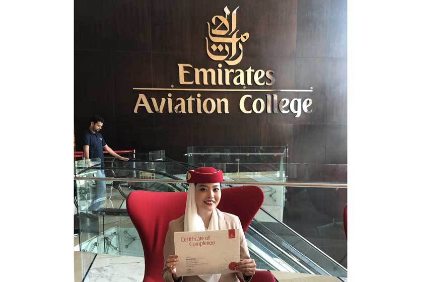 私はECC国際外語を卒業時、実は日本の航空会社から内定をいただいていました。しかし、私の夢はあくまでも外資系航空会社の客室乗務員。だから、思い切って内定を辞退し、もっと英語力を高めるためにマレーシアでの3ヶ月のインターンシップに参加。その後、ジェットスター・アジアに就職。そこで客室乗務員として経験を積み、英語力を磨いてから、一番憧れていたエミレーツ航空に転職したのです。高校を卒業後、大学や専門学校に進んで卒業とともに職業を決めるというルートだけではないと思うんです。なりたい自分を実現するには、そのなり方も自分しだい。決められた道なんてない!と思います。