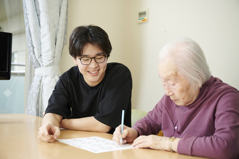 テレビ番組で介護福祉士という職業を見たときに、“自分がやりたいことってこういうことなのかな”と興味をもったのがきっかけでした。自分は人の為に動いたり、何かをして喜んでもらうことが小さい頃から好きだったり、同居していた祖父母のことが好きだったというのも、この分野を選んだ理由だと思います。中学の職場体験で初めて特別養護老人ホームに行ったとき、「特養は、人生の最期を過ごす場所でもあるんだよ」と教わりました。中学生ながらにして“人の最期まで立ち会える仕事ってなかなかないな”と思い、介護福祉士という仕事に魅力を感じました。