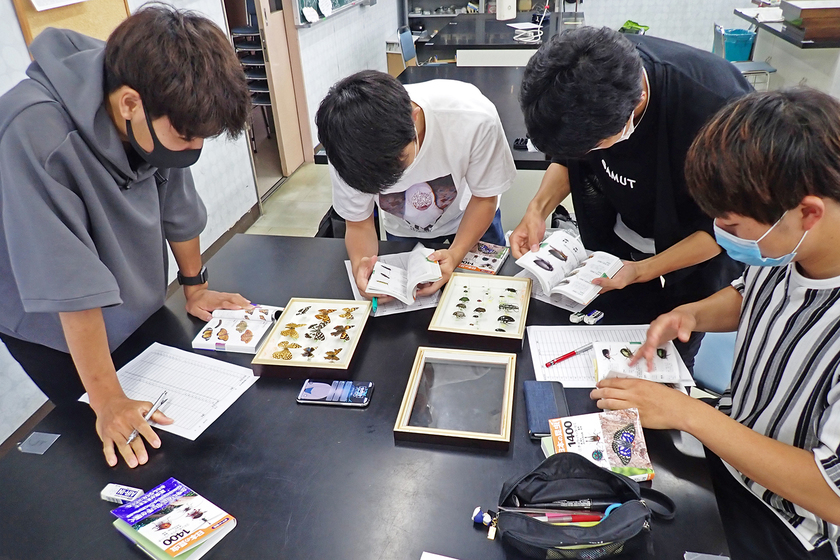 生きものの絶滅が心配される今、現場でどのような生きものが、どんな生活をしていて、どれくらいいるのかなどの生態や実態を知ることが大切です。そのため、本校の実習は野外で生きものの見分け方や調査方法を学ぶとともに、室内では標本作製や図鑑の使い方を身につけています。