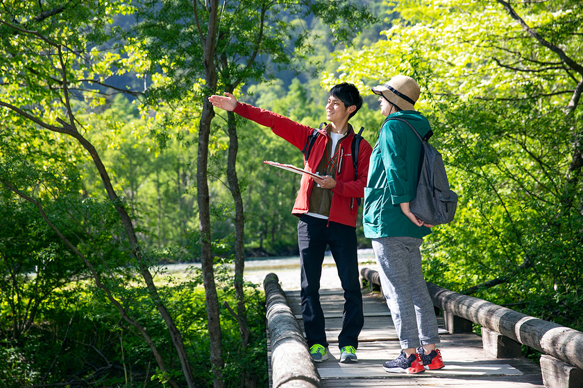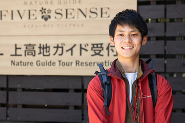長野県松本市にある山岳景勝地「上高地」で、ネイチャーガイドとして働いています。ガイド担当は自分を入れて4人おり、日中のガイドをメインに、早朝やナイトガイドなども行っています。迫り来る山々と清らかな清流をはじめとする圧巻の大自然のなか、日々移りゆく変化に感動を得られる常駐ガイドとして関わっていられることが最大の魅力です。さまざまな目的で訪れるお客様に向け、“上高地をもっと好きになってもらいたい”をモットーに、お客様にただ“教える”ガイドではなく、ともに“学ぶ”ガイドを心がけています。そして、ガイド終了時に「お願いして良かったです」と笑顔で言っていただけることが、この仕事の一番のやりがいです。