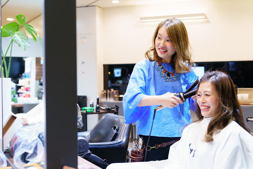 お客様の喜ぶ姿を間近で見られることが一番の魅力でありやりがいです。自分の努力次第で、より多くのお客様に喜んでいただくことができるから。また、仕事を通じて、もともと大好きな美容を勉強し続けられるのも私にとってうれしいことです。職場のスタッフはみんな仲が良いので、毎日楽しく仕事に取り組んでいます。もちろんときには悩んだり、上手くいかないこともありますが、周囲の人に支えられて、今、本当に充実した時間を過ごせていると思います。