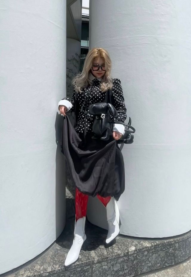 「フリンジベストに白のウエスタンブーツを合わせた、