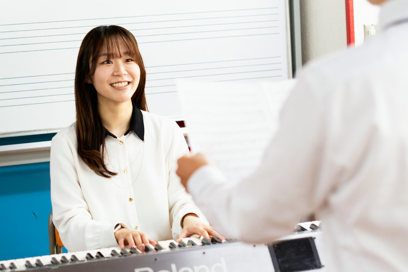 音楽に初めて触れたのは、両親の勧めで、5歳からクラシックピアノを習いはじめたことでした。その頃から音楽がどんどん好きになり、中学生では独学でポップスを弾くようになりました。高校生のときに、『音楽を基礎から学びたい』と思うようになり、ミューズ音楽院のオープンキャンパスに行ったときに、先生のレッスンが一番楽しかったので学校を決めました。他にも大学や専門学校を見に行きましたが、一番基本に忠実で技術を磨ける学校はミューズ音楽院だと感じました。学校生活のなかで、先生になることが自分のやりたいことだと気づき、今ではミューズの先生みたいに、生徒さんと向き合うことを大切に指導しています。