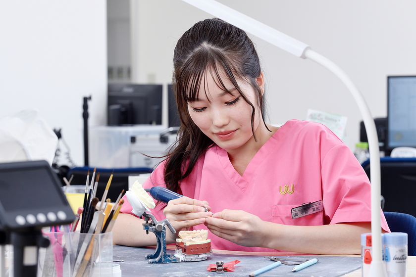 和田精密歯研株式会社勤務/歯科技工士科 卒/2024年卒/「ものづくりへの強い興味」と「家族からの勧め」がきっかけとなり、歯科技工士を目指す。愛知学院大学歯科技工専門学校のオープンキャンパスでは、最新の歯科技工技術を学べる施設が充実している点、また同じ敷地内の大学病院で現場の見学や実習が可能な環境に強く惹かれて進学。卒業後は、和田精密歯研株式会社へ入社し、現在は主に自費診療のインプラントやセラミック製の補綴物などを製作している。「医療系の仕事は難しいという先入観がありましたが、技工物の製作を通して、ものづくりの楽しさと人の役に立つ喜びを日々感じながら取り組んでいます」と語る。
