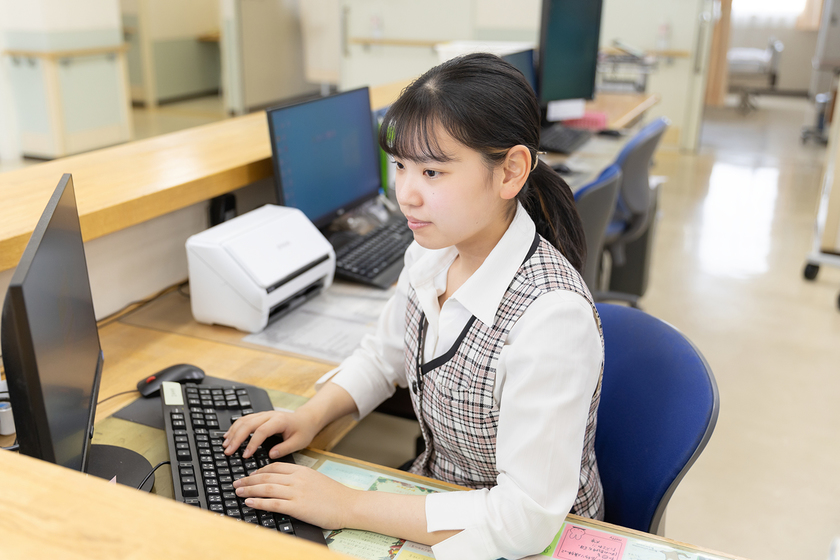 病棟事務として、主に入院患者さんの会計入力やレセプト請求を行っていますが、外来の受付においてもレジや電話応対、患者さんの対応などさまざまな業務があり、先輩に教わりながら知識の幅を広げています。常にチャレンジする姿勢を大切にして、何事も経験あるのみと考えています。退院する方から「ありがとう」と声をかけていただくなど、特に患者さんとのコミュニケーションを通して仕事のやりがいを実感しています。ゆくゆくは外来も入院も両方の業務を担当できる医療事務へと成長することが大きな目標です。そのためにもわからないことは積極的に自分で調べたり、お手本となる先輩に聞いたりして、知識を増やしていけるよう心がけています。
