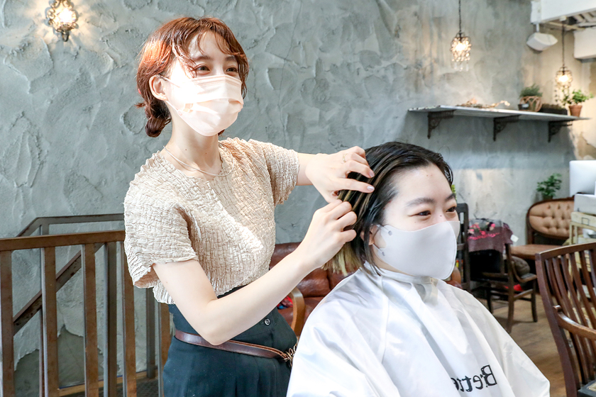 どんな場所や環境で働くか?そこで自分に何ができるか?その答えを自分で探せるのも、美容師という仕事だと思います。東京の有名店ではなく、私が大阪のアットホームなサロンを選んだのは、学生時代の一人暮らしを通して人の温かさを大切に思えたから。そこには“自分の力でお店を有名にしたい!”という目標もありました。現在、SNSを通して積極的に作品発信を続けているのもそのひとつの方法。私の髪型を見て“同じスタイルにしてほしい”と来店してくださるお客様も増えていて、影響力の大きさとやりがいを感じます。フォロワーさんに新たな感動や発見を届けるため、常に工夫を心掛けようという意識が、美容師の探求心にもつながっています。