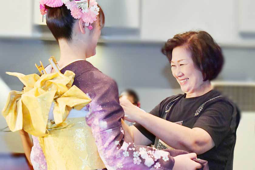 日本着付学術会の芸術委員でもある谷先生。学生に現場で喜ばれる美しい着付けの技術を披露。