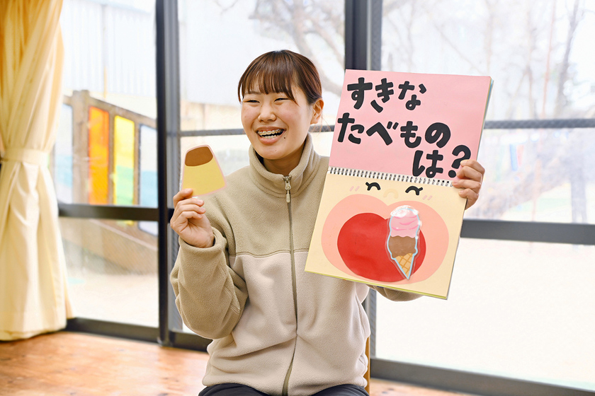 就職して最初の3年間乳幼児を担当した時、すごく役に立ったのは、学生時代に学んだ発達や言葉についての知識です。特にこどもの発話が遅いと悩んでおられた保護者の方に相談を受けた時には、正しい知識をお伝えすることで安心していただけたのは良かったです。他にも学生時代に教わった手遊びやゲーム、自作のエプロンシアターなどは、こども達がすごく喜んでくれますし、工作の授業で色んなものをつくった経験も、様々な場面で活かせていますね。今、あらためて考えると、学生時代に先生方から教わったことすべてが実践的で、保育士として働く今の私の支えになっていることを実感できています。