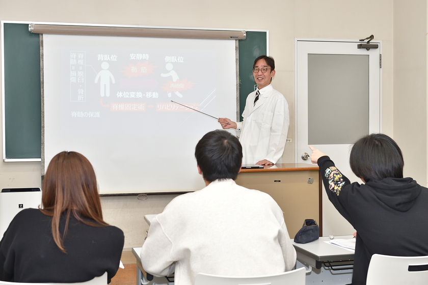 3年間かけて、はり師・きゅう師・あん摩マッサージ指圧師の国家試験合格に向けた専門知識と高度な手技を修得する鍼灸科。河合先生は医療機関での経験を授業に還元しながら「臨床医学総論」と「リハビリテーション医学」の講義を担当。さらに、2年と3年で実施される外部施設での見学実習における調整・指導も行っている。学生たちが最も興味を示さない分野をあえて選び、実際に自分の目で現場を見て将来像につなげるなど、自分の知識と技術をどう活用していくかについて、視野を広げて考えるきっかけを提供している。