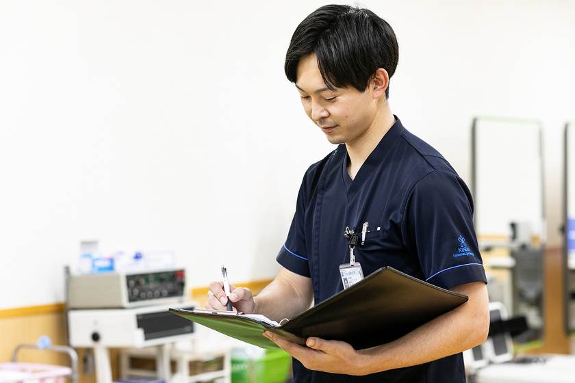 当院は急性期病院で、入院患者様を対象として運動器疾患の術後や、脳血管疾患、呼吸器疾患、循環器疾患、がん発症後のリハビリテーションを主に行っています。理学療法士の仕事で「これが原因でこうなっている」というように「〇〇である」と言い切るのはとても難しいことだと思っています。「Aではない」「Bでもない」「残ったCであるかもしれない」と地道に選択肢を消していく作業が大切だと感じています。だからこそ、自分を客観的にみながら、「本当にこの臨床推論で正しいのか」と自問自答することが重要。まだまだ勉強不足のため今後も様々な資格を取得したいです。やりたいことは尽きません。それが面白さなのかもしれません。